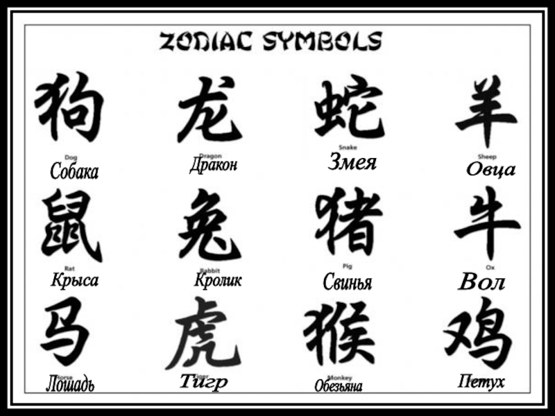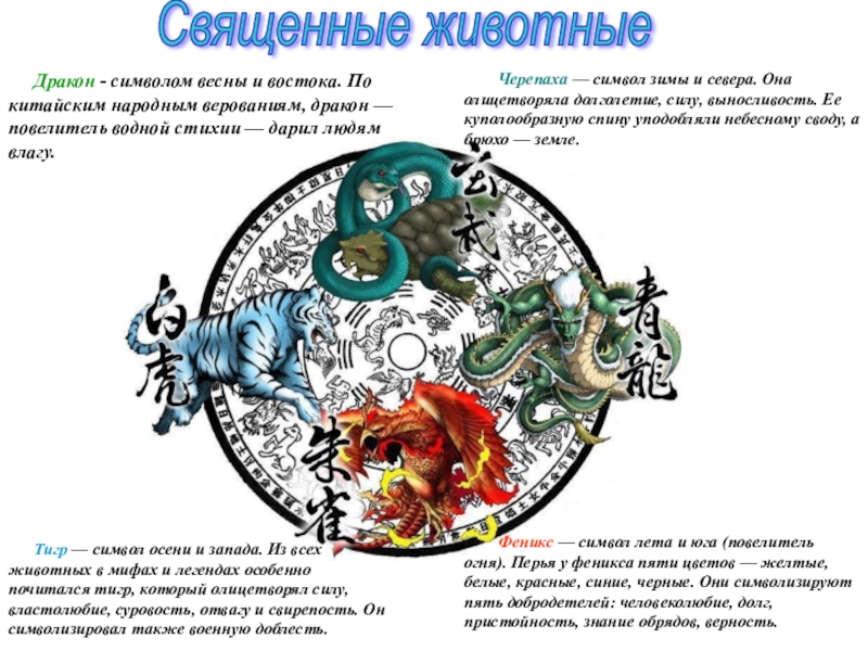Тигр — символ осени и запада. Из всех животных в мифах и легендах особенно почитался тигр, который олицетворял силу, властолюбие, суровость, отвагу и свирепость. Он символизировал также военную доблесть.