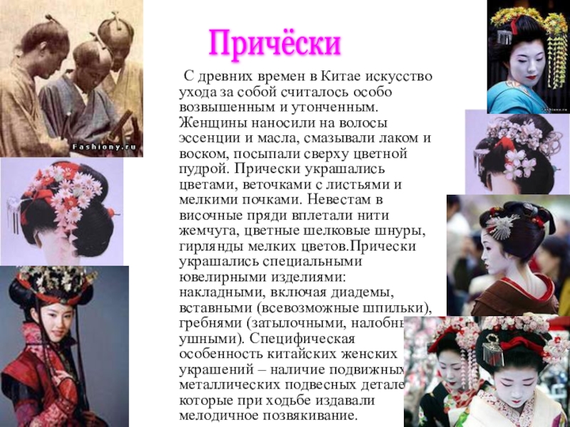 собой считалось особо возвышенным и утонченным. Женщины наносили на волосы эссенции и масла, смазывали лаком и воском, посыпали сверху цветной пудрой. Прически украшались цветами, веточками с листьями и мелкими почками. Невестам в височные пряди вплетали нити жемчуга, цветные шелковые шнуры, гирлянды мелких цветов.Прически украшались специальными ювелирными изделиями: накладными, включая диадемы, вставными (всевозможные шпильки), гребнями (затылочными, налобными, ушными). Специфическая особенность китайских женских украшений – наличие подвижных металлических подвесных деталей, которые при ходьбе издавали мелодичное позвякивание.