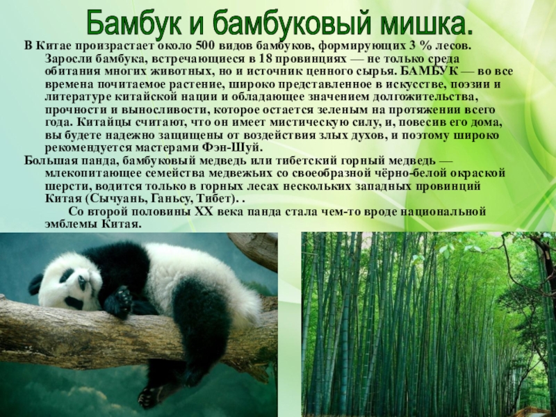 бамбука, встречающиеся в 18 провинциях — не только среда обитания многих животных, но и источник ценного сырья. БАМБУК — во все времена почитаемое растение, широко представленное в искусстве, поэзии и литературе китайской нации и обладающее значением долгожительства, прочности и выносливости, которое остается зеленым на протяжении всего года. Китайцы считают, что он имеет мистическую силу, и, повесив его дома, вы будете надежно защищены от воздействия злых духов, и поэтому широко рекомендуется мастерами Фэн-Шуй.