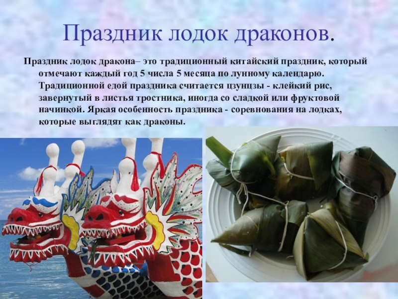 Праздник лодок дракона– это традиционный китайский праздник, который отмечают