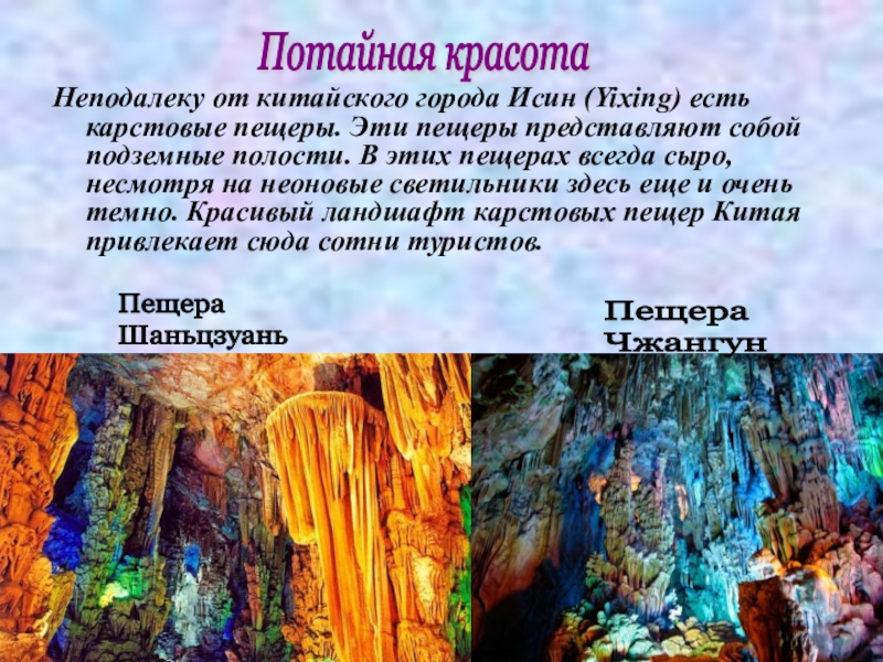 представляют собой подземные полости. В этих пещерах всегда сыро, несмотря на неоновые светильники здесь еще и очень темно. Красивый ландшафт карстовых пещер Китая привлекает сюда сотни туристов.