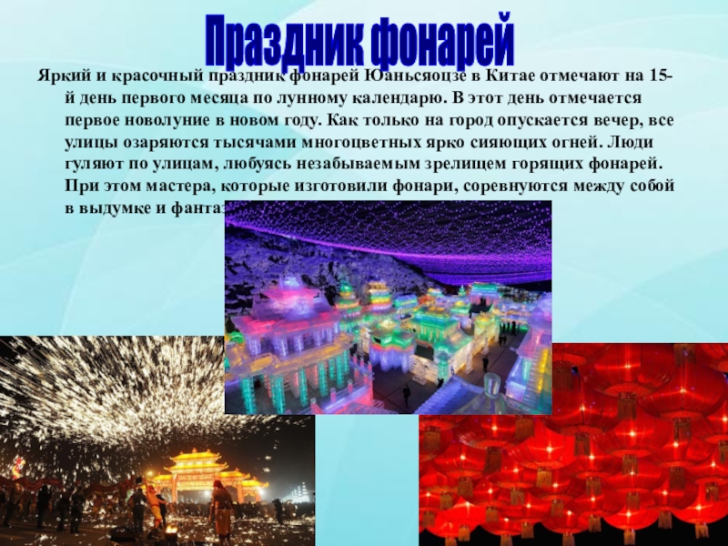 Слайд 7Яркий и красочный праздник фонарей Юаньсяоцзе в Китае отмечают на 15-й