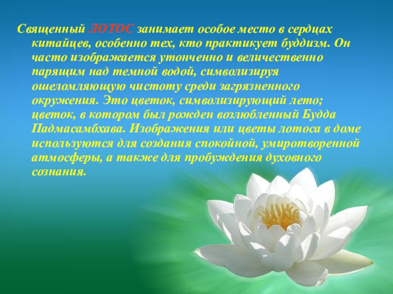 Слайд 23Священный ЛОТОС занимает особое место в сердцах китайцев, особенно тех, кто