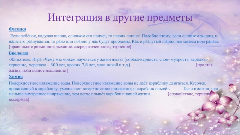 Поверхностное натяжение воды. Поверхностное натяжение воды не даёт кораблику двигаться. Кусочек, привязанный к кораблику, уменьшает поверхностное натяжение, и кораблик плывёт. Так и в жизни, чем меньше внутреннее напряжение, тем легче плывёт кораблик нашей жизни. (спокойствие, терпение, выдержка)