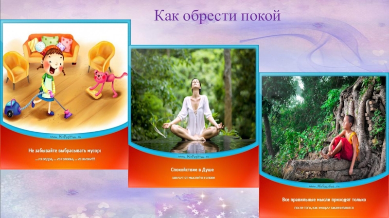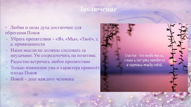 Внутренний Покой можно обрести только полностью освободившись от желаний. Пока вас связывают желания Умиротворения вам не достигнуть.