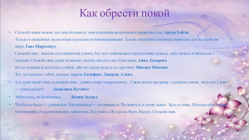 Спокойствие - важная составляющая успеха, без него невозможно продуктивно думать, действовать и общаться с людьми. Спокойствие души позволяет разуму владеть над чувствами. Анна Дуварова