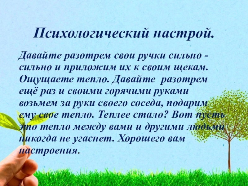 к своим щекам. Ощущаете тепло. Давайте разотрем ещё раз и своими горячими руками возьмем за руки своего соседа, подарим ему свое тепло. Теплее стало? Вот пусть это тепло между вами и другими людьми никогда не угаснет. Хорошего вам настроения.