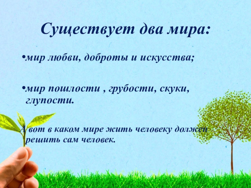 Существует два мира: мир любви, доброты и искусства; мир пошлости , грубости, скуки, глупости.А вот в каком