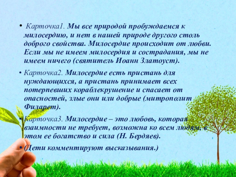 Карточка3. Милосердие – это любовь, которая взаимности не требует, возможна ко всем людям, в этом ее богатство и сила (Н. Бердяев).