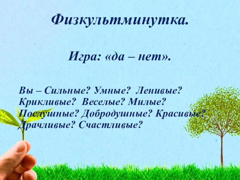 Физкультминутка. Игра: «да – нет».Вы – Сильные? Умные? Ленивые? Крикливые? Веселые? Милые? Послушные? Добродушные? Красивые? Драчливые? Счастливые?