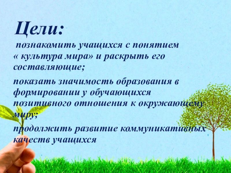 Цели: познакомить учащихся с понятием « культура мира» и раскрыть его составляющие;показать значимость образования в формировании у обучающихся позитивного отношения к окружающему миру; продолжить развитие коммуникативных качеств учащихся