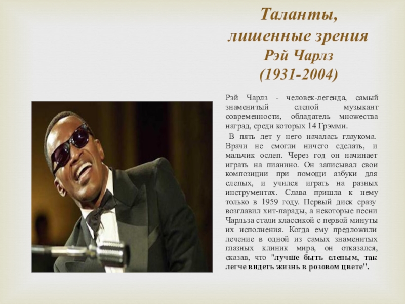 слепой музыкант современности, обладатель множества наград, среди которых 14 Грэмми.