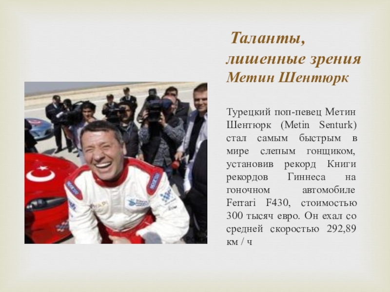 стал самым быстрым в мире слепым гонщиком, установив рекорд Книги рекордов Гиннеса на гоночном автомобиле Ferrari F430, стоимостью 300 тысяч евро. Он ехал со средней скоростью 292,89 км / ч