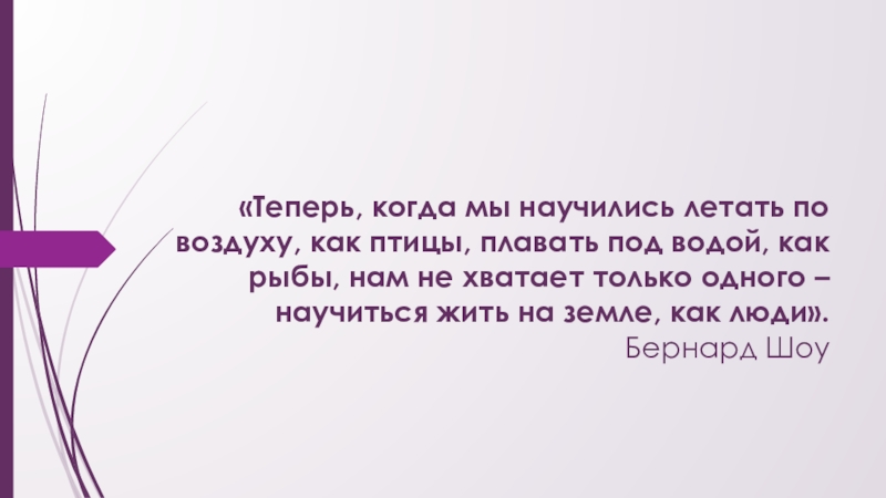 Английский писатель Бернард Шоу однажды написал: «Теперь, когда мы научились летать по воздуху, как птицы, плавать под водой, как рыбы, нам не хватает только одного – научиться жить на земле, как люди».