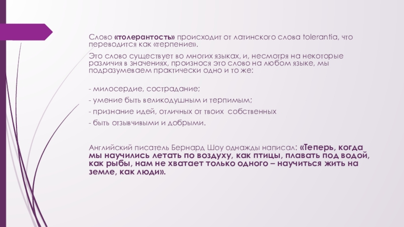 Слово «толерантость» происходит от латинского слова tolerantia, что переводится как «терпение».