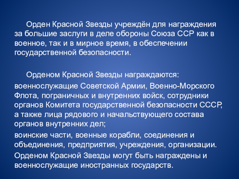 Слайд 18 Орден Красной Звезды учреждён для награждения за большие заслуги в деле