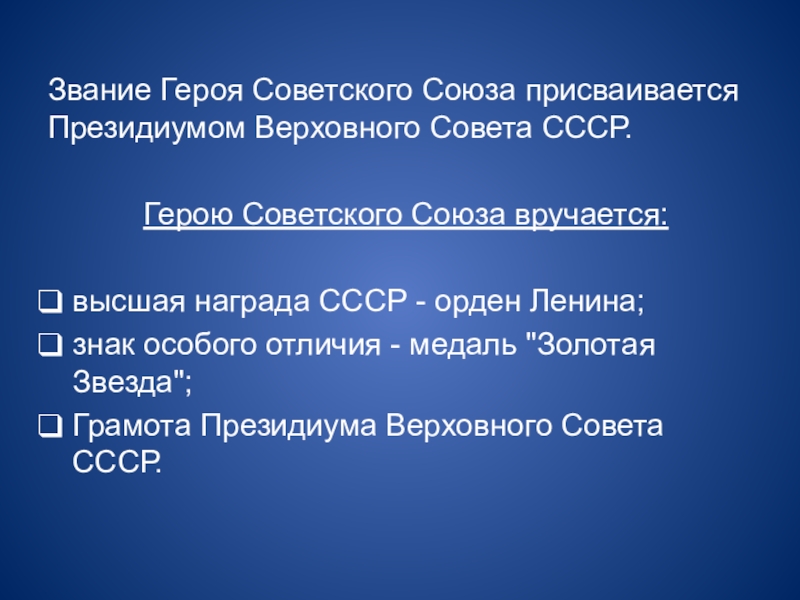 Слайд 8Звание Героя Советского Союза присваивается Президиумом Верховного Совета СССР.