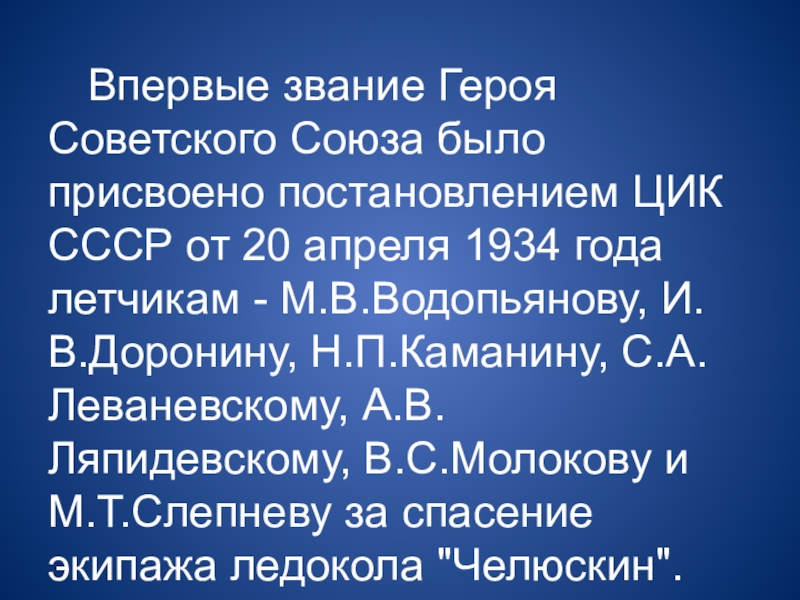 20 апреля 1934 года летчикам - М.В.Водопьянову, И.В.Доронину, Н.П.Каманину, С.А.Леваневскому, А.В.Ляпидевскому, В.С.Молокову и М.Т.Слепневу за спасение экипажа ледокола "Челюскин".