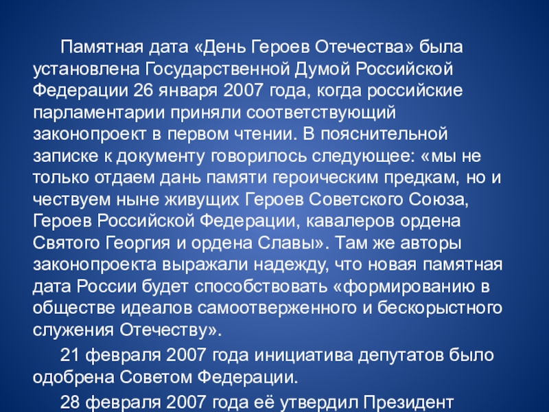 26 января 2007 года, когда российские парламентарии приняли соответствующий законопроект в первом чтении. В пояснительной записке к документу говорилось следующее: «мы не только отдаем дань памяти героическим предкам, но и чествуем ныне живущих Героев Советского Союза, Героев Российской Федерации, кавалеров ордена Святого Георгия и ордена Славы». Там же авторы законопроекта выражали надежду, что новая памятная дата России будет способствовать «формированию в обществе идеалов самоотверженного и бескорыстного служения Отечеству».