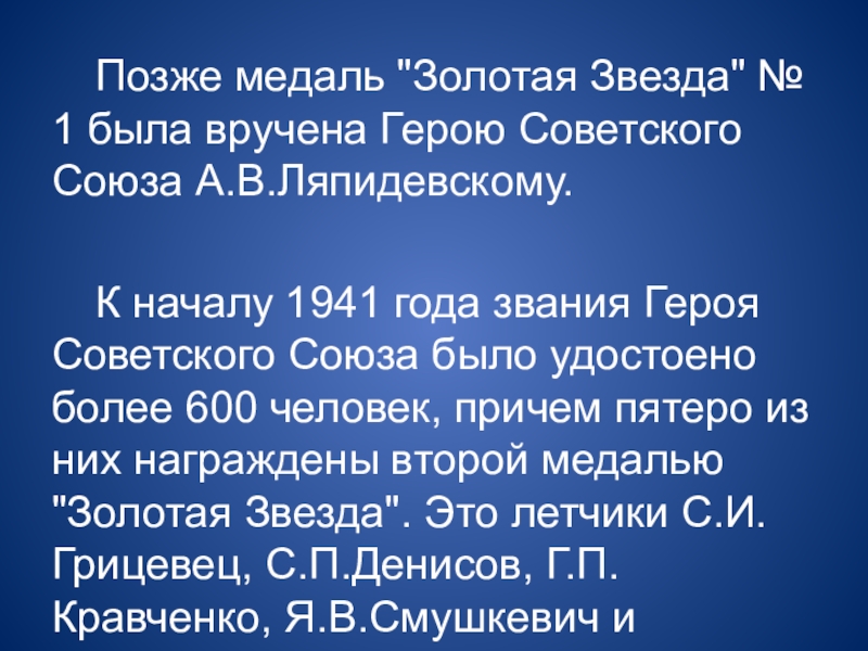 К началу 1941 года звания Героя Советского Союза было удостоено более 600 человек, причем пятеро из них награждены второй медалью "Золотая Звезда". Это летчики С.И.Грицевец, С.П.Денисов, Г.П.Кравченко, Я.В.Смушкевич и полярный исследователь И.Д.Папанин.