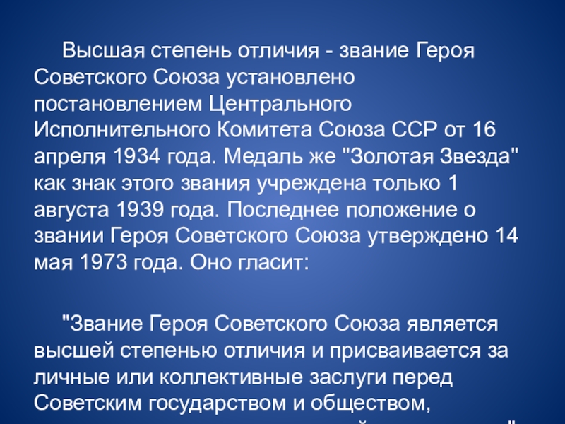 "Звание Героя Советского Союза является высшей степенью отличия и присваивается за личные или коллективные заслуги перед Советским государством и обществом, связанные с совершением геройского подвига".