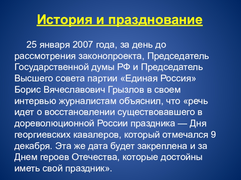 Председатель Государственной думы РФ и Председатель Высшего совета партии «Единая Россия» Борис Вячеславович Грызлов в своем интервью журналистам объяснил, что «речь идет о восстановлении существовавшего в дореволюционной России праздника — Дня георгиевских кавалеров, который отмечался 9 декабря. Эта же дата будет закреплена и за Днем героев Отечества, которые достойны иметь свой праздник».