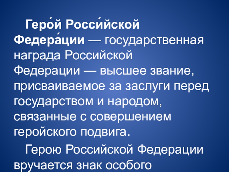 Слайд 20 Геро́й Росси́йской Федера́ции — государственная награда Российской Федерации — высшее звание, присваиваемое за заслуги