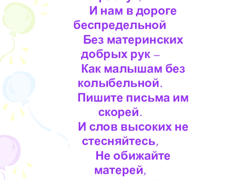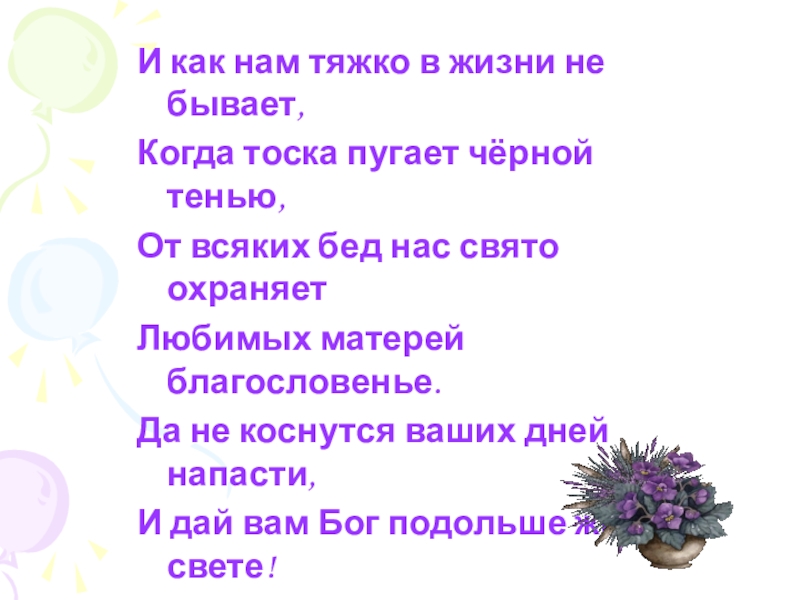 самого близкого, дорогого, единственного. Материнская любовь греет нас до старости. Мама учит нас быть мудрыми, она переносит все наши беды вместе с нами, она нам дает жизнь.