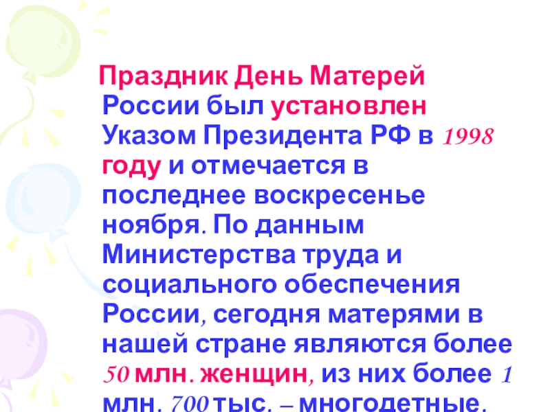 1998 году и отмечается в последнее воскресенье ноября. По данным Министерства труда и социального обеспечения России, сегодня матерями в нашей стране являются более 50 млн. женщин, из них более 1 млн. 700 тыс. – многодетные. Многие страны отмечают собственный день Матери.