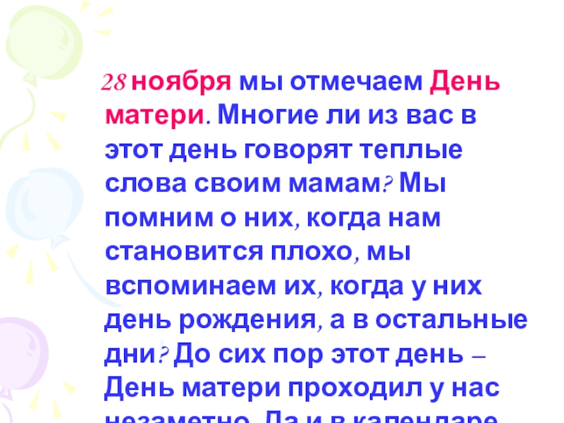 Слайд 4 28 ноября мы отмечаем День матери. Многие ли из вас
