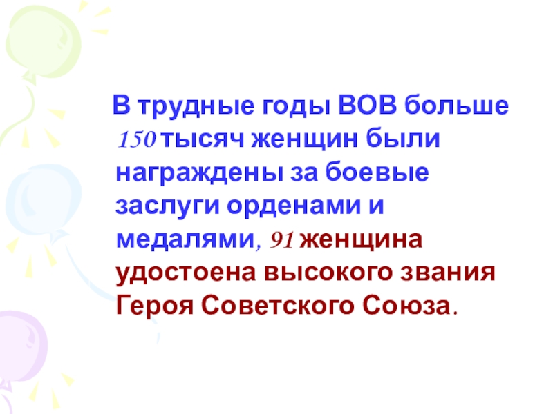 Слайд 7 В трудные годы ВОВ больше 150 тысяч женщин были награждены