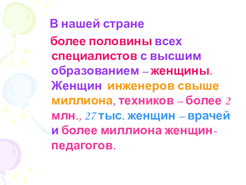 высшим образованием – женщины. Женщин инженеров свыше миллиона, техников – более 2 млн., 27 тыс. женщин – врачей и более миллиона женщин-педагогов.