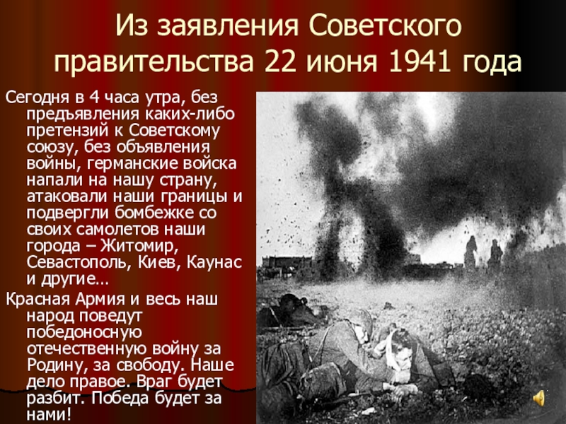 Слайд 4Из заявления Советского правительства 22 июня 1941 года