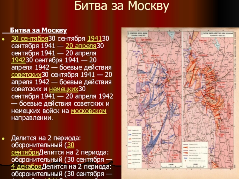 Делится на 2 периода: оборонительный (30 сентябряДелится на 2 периода: оборонительный (30 сентября — 4 декабряДелится на 2 периода: оборонительный (30 сентября — 4 декабря 1941Делится на 2 периода: оборонительный (30 сентября — 4 декабря 1941) и наступательный, который состоит из 2 этапов: контрнаступления (5-6 декабря 1941 — 7-8 января 1942) и общего наступления советских войск (7-10 января — 20 апреляДелится на 2 периода: оборонительный (30 сентября — 4 декабря 1941) и наступательный, который состоит из 2 этапов: контрнаступления (5-6 декабря 1941 — 7-8 января 1942) и общего наступления советских войск (7-10 января — 20 апреля 1942).
