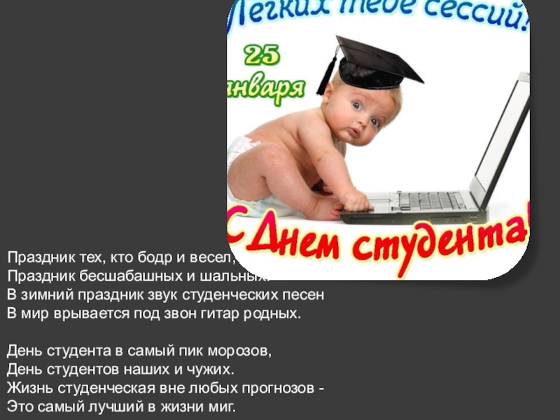 В зимний праздник звук студенческих песен В мир врывается под звон гитар родных. День студента в самый пик морозов, День студентов наших и чужих. Жизнь студенческая вне любых прогнозов - Это самый лучший в жизни миг.