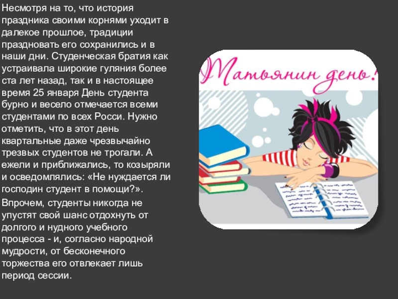 прошлое, традиции праздновать его сохранились и в наши дни. Студенческая братия как устраивала широкие гуляния более ста лет назад, так и в настоящее время 25 января День студента бурно и весело отмечается всеми студентами по всех Росси. Нужно отметить, что в этот день квартальные даже чрезвычайно трезвых студентов не трогали. А ежели и приближались, то козыряли и осведомлялись: «Не нуждается ли господин студент в помощи?».