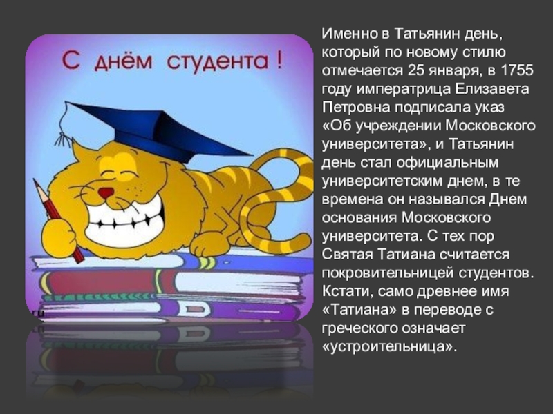 в 1755 году императрица Елизавета Петровна подписала указ «Об учреждении Московского университета», и Татьянин день стал официальным университетским днем, в те времена он назывался Днем основания Московского университета. С тех пор Святая Татиана считается покровительницей студентов. Кстати, само древнее имя «Татиана» в переводе с греческого означает «устроительница».