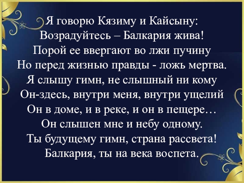 Я говорю Кязиму и Кайсыну: Возрадуйтесь – Балкария жива! Порой ее ввергают во лжи пучину Но перед