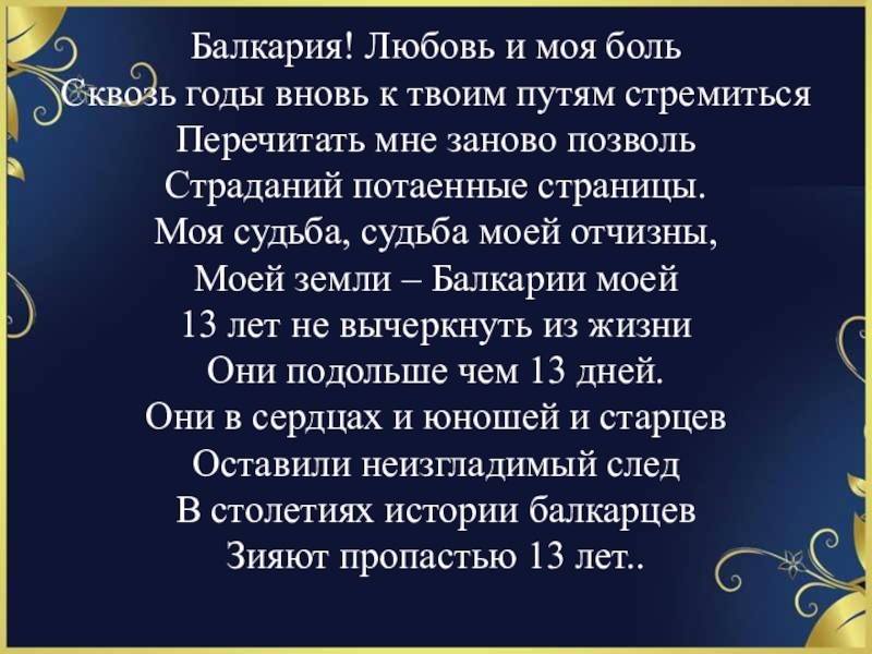 мне заново позволь Страданий потаенные страницы. Моя судьба, судьба моей отчизны, Моей земли – Балкарии моей 13 лет не вычеркнуть из жизни Они подольше чем 13 дней. Они в сердцах и юношей и старцев Оставили неизгладимый след В столетиях истории балкарцев Зияют пропастью 13 лет..