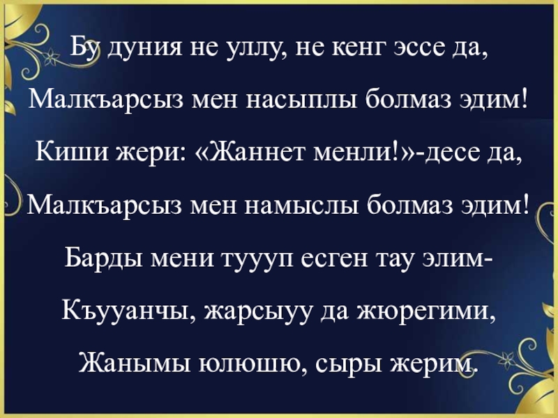 Слайд 12 Бу дуния не уллу, не кенг эссе да, Малкъарсыз мен насыплы болмаз