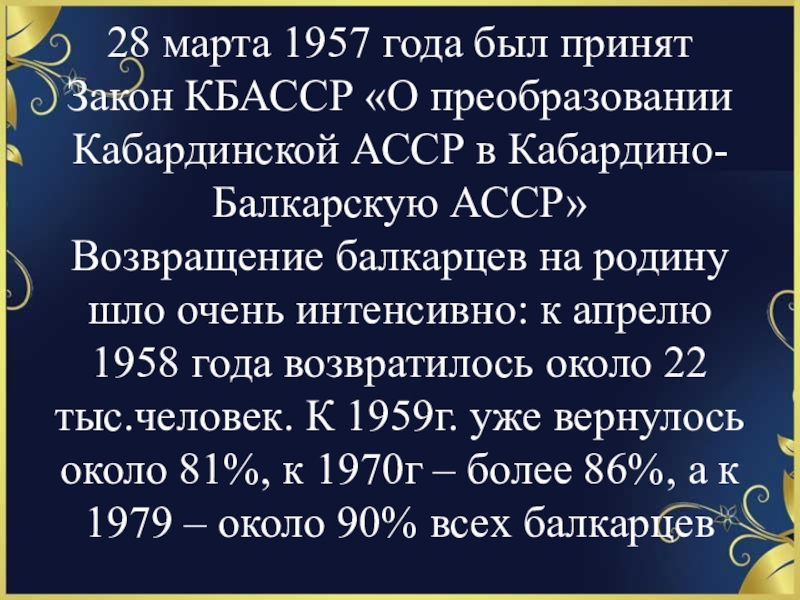 АССР в Кабардино-Балкарскую АССР» Возвращение балкарцев на родину шло очень интенсивно: к апрелю 1958 года возвратилось около 22 тыс.человек. К 1959г. уже вернулось около 81%, к 1970г – более 86%, а к 1979 – около 90% всех балкарцев