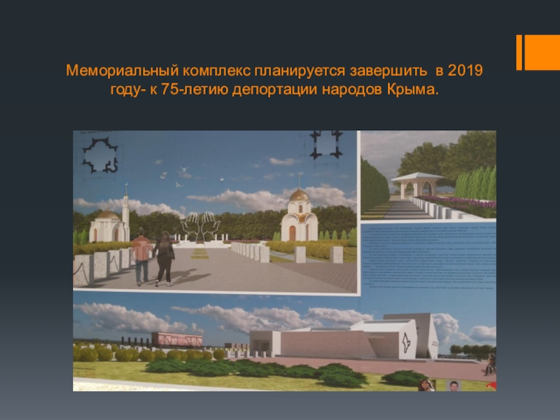 Слайд 12Мемориальный комплекс планируется завершить в 2019 году- к 75-летию депортации народов