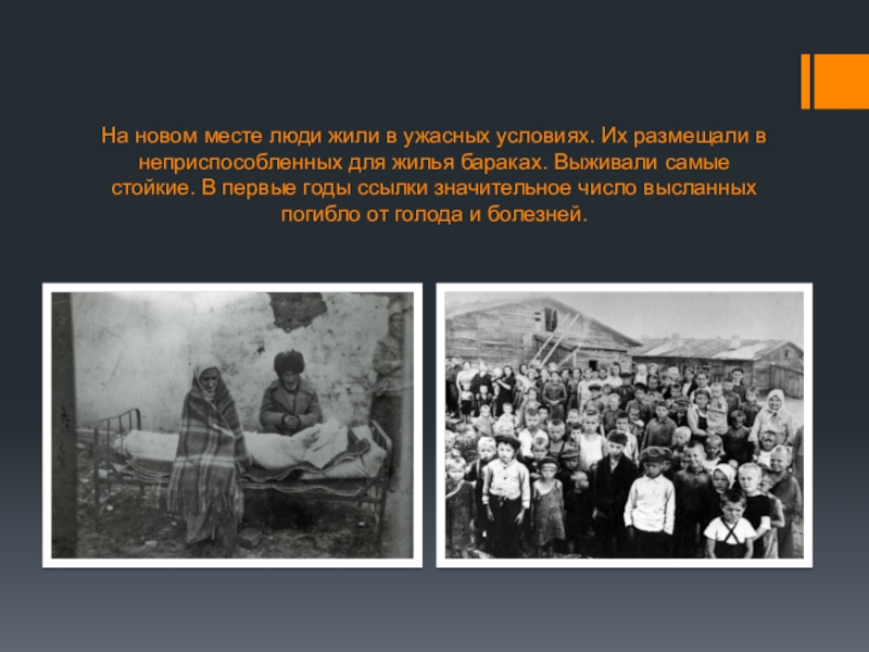 Слайд 7На новом месте люди жили в ужасных условиях. Их размещали в