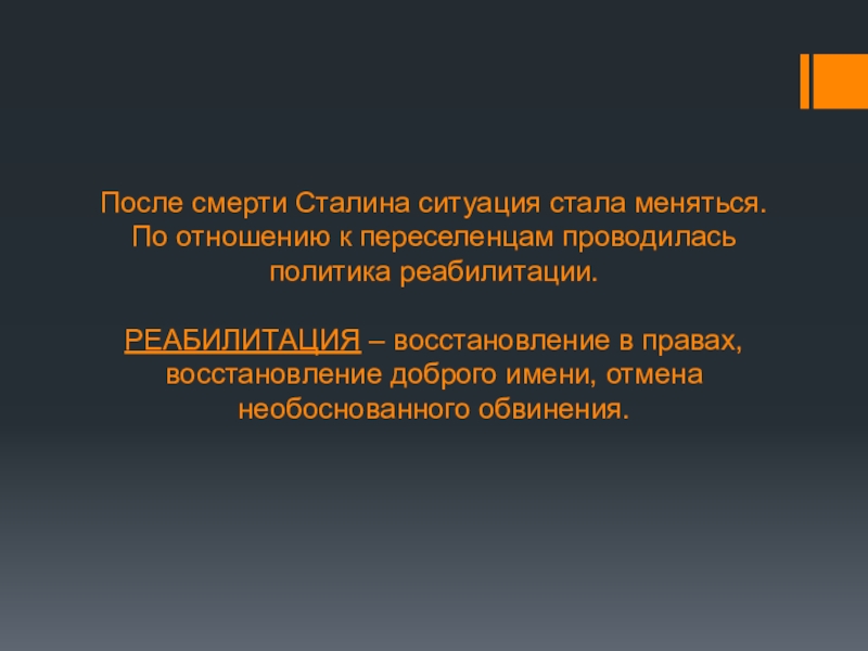 После смерти Сталина ситуация стала меняться. По отношению к переселенцам проводилась политика реабилитации.  РЕАБИЛИТАЦИЯ – восстановление