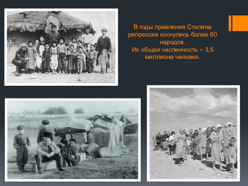 Слайд 3В годы правления Сталина репрессии коснулись более 60 народов. Их общая численность