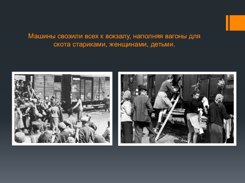 Слайд 5Машины свозили всех к вокзалу, наполняя вагоны для скота стариками, женщинами,
