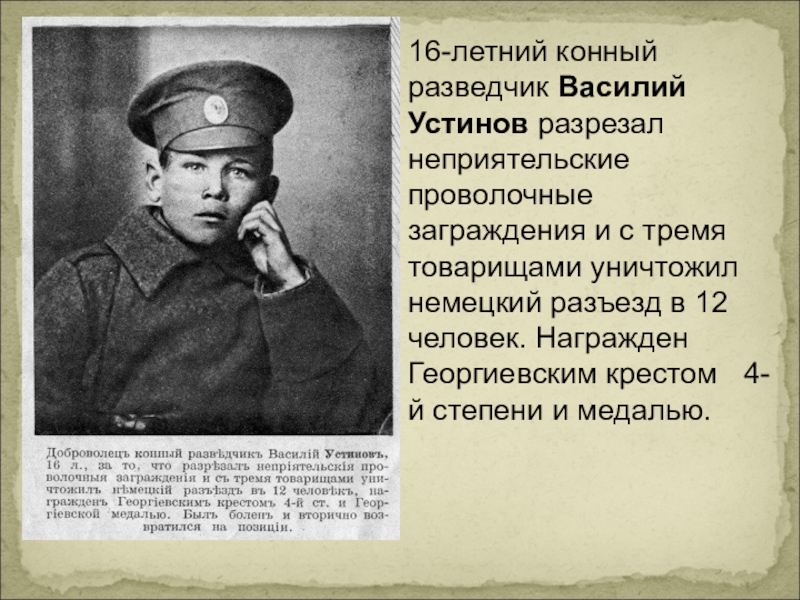 Слайд 1516-летний конный разведчик Василий Устинов разрезал неприятельские проволочные заграждения и с
