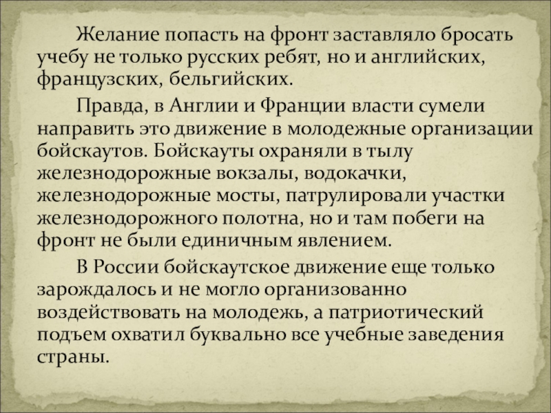 Правда, в Англии и Франции власти сумели направить это движение в молодежные организации бойскаутов. Бойскауты охраняли в тылу железнодорожные вокзалы, водокачки, железнодорожные мосты, патрулировали участки железнодорожного полотна, но и там побеги на фронт не были единичным явлением.