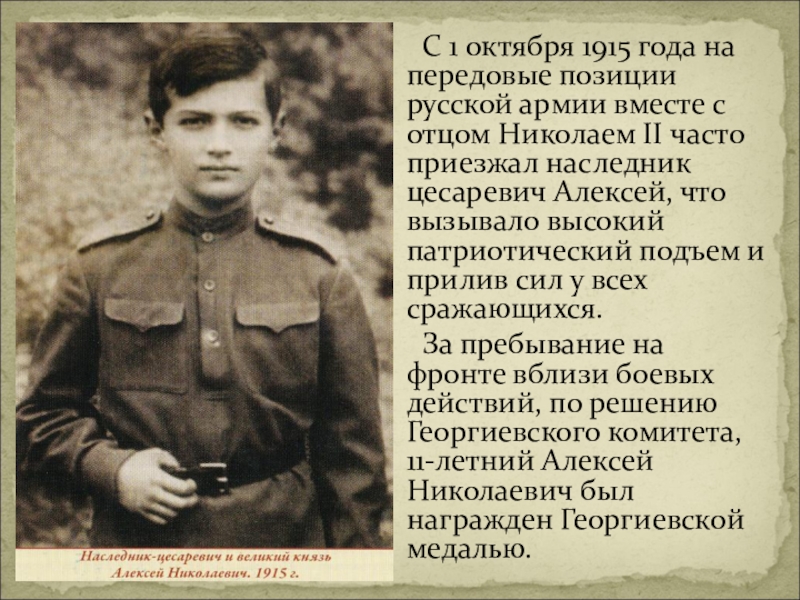 За пребывание на фронте вблизи боевых действий, по решению Георгиевского комитета, 11-летний Алексей Николаевич был награжден Георгиевской медалью.