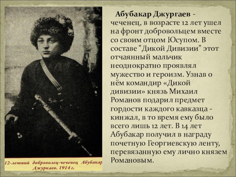 Слайд 10 Абубакар Джургаев - чеченец, в возрасте 12 лет ушел на фронт добровольцем